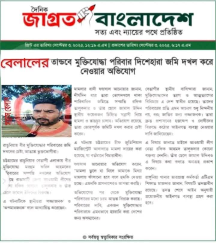 গত ৩ সেপ্টেম্বর দৈনিক জাগ্রত বাংলাদেশ পত্রিকায় মুক্তিযোদ্ধা পরিবারের নামে প্রকাশিত সংবাদে আওয়ামী লীগ নেতা রফিক আহমদ তালুকদারের ছবির স্থলে উদ্দেশ্যমূলকভাবে বেলাল নামক একজনে ছবি ব্যবহারসহ দৈনিক জাগ্রত বাংলাদেশ পত্রিকার লোগো হুবহু নকল করে অনলাইনে প্রিন্ট আকারে নকল করা হয়েছে। দৈনিক জাগ্রত বাংলাদেশ অনলাইন নিউজ পোর্টাল পত্রিকার সুনাম ক্ষুন্ন করার উদ্দেশ্য ওইরকম নিউজ প্রচার করা হয়েছে। এই ভুয়া ও বিভ্রান্তিকর সংবাদ প্রকাশের তীব্র প্রতিবাদ জানাচ্ছি। ভবিষ্যতে এ ধরনের অপপ্রচার বন্ধ না হলে সংশ্লিষ্টদের বিরুদ্ধে আইনগত ব্যবস্থা গ্রহণ করা হবে।