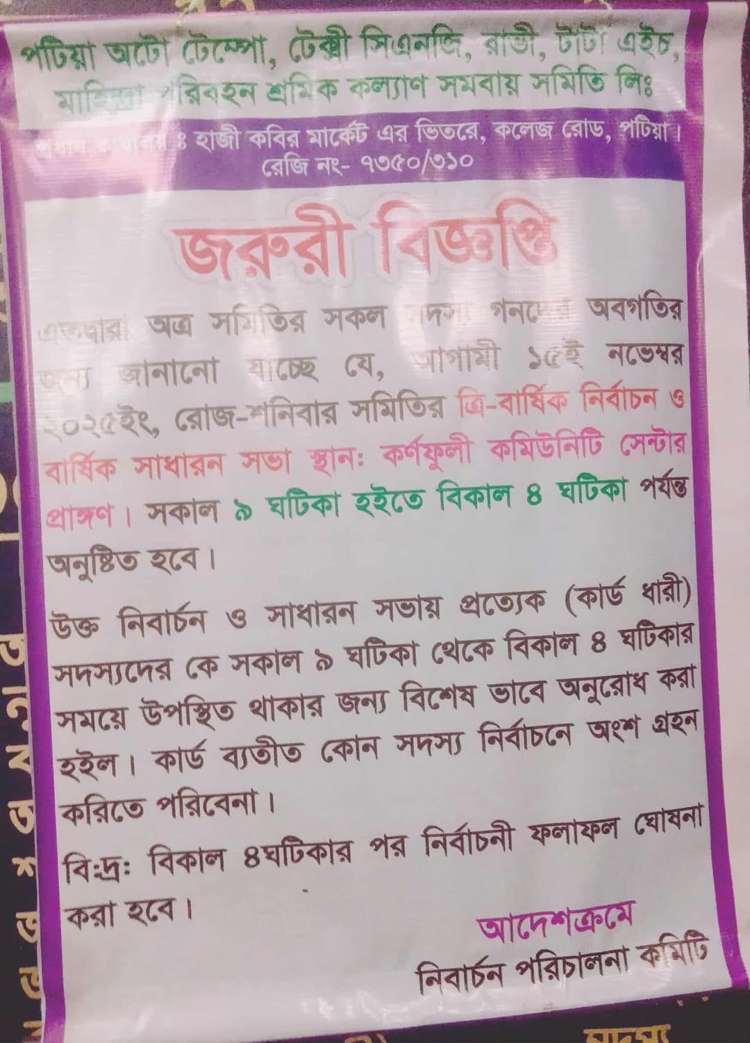 রেজি নং- ৭৩৫০/৩১০, এক জরুরী বিজ্ঞপ্তি প্রকাশ করেছেন। বিজ্ঞপ্তিতে অত্র সমিতির সকল সদস্যগনদের অবগতির