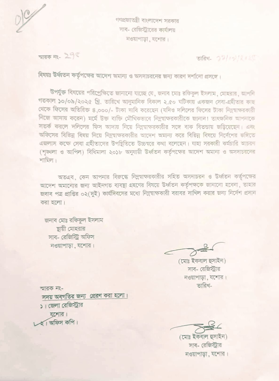 যশোরের অভয়নগর উপজেলার নওয়াপাড়া সাব-রেজিস্ট্রি অফিসে দলিল নিবন্ধনের ক্ষেত্রে অনিয়ম ও অতিরিক্ত অর্থ আদায়ের অভিযোগ উঠেছে। এ ঘটনায় অভিযুক্ত মোহরার মোঃ রফিকুল ইসলামের বিরুদ্ধে বৃহস্পতিবার (১১ সেপ্টেম্বর) ২৭৫ নং স্বারকে কারণ দর্শানোর নোটিশ জারি করেছে সংশ্লিষ্ট কর্তৃপক্ষ।