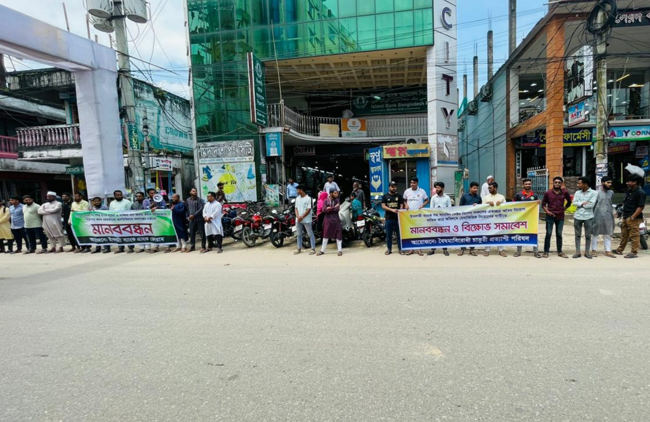 ইসলামী ব্যাংকসহ দেশের ব্যাংকিং খাতে অবৈধ নিয়োগ বাতিল ও মেধাভিত্তিক নিয়োগের দাবিতে মৌলভীবাজারের শ্রীমঙ্গলে মানববন্ধন ও বিক্ষোভ সমাবেশ অনুষ্ঠিত হয়েছে।