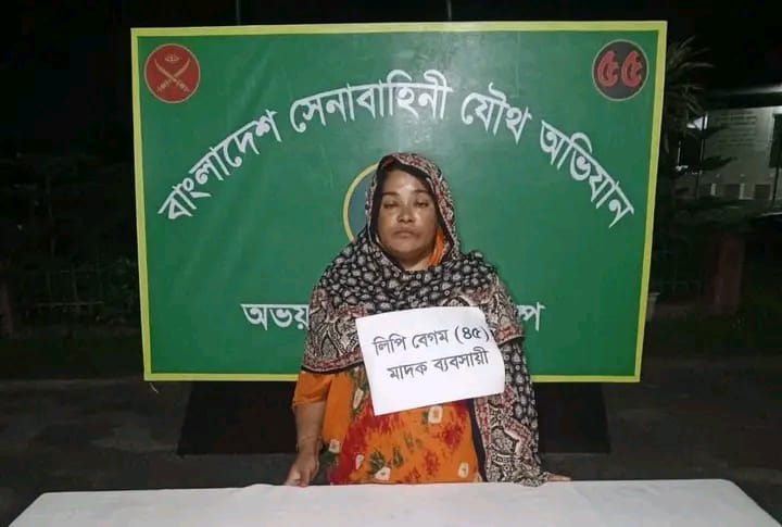 যশোরের অভয়নগরে সেনাবাহিনী ও পুলিশের যৌথ অভিযানে,অভয়নগরের চিহ্নিত মাদক সম্রাজ্ঞী লিপি বেগম(৪৫)কে ইয়াবাসহ আটক করা হয়েছে। বৃহস্পতিবার (৯ অক্টোবর) রাত ২ টার দিকে উপজেলার বুইকরা আকুঞ্জি পাড়া এলাকার লিপি’র বসতবাড়ি থেকে তাকে আটক করা হয়। আটক লিপি বেগম ওই এলাকার মৃত হিরু মোল্যার স্ত্রী। সেনা কর্মকর্তা ক্যাপ্টেন সানজিত আহম্মেদ আটকের বিষয়টি নিশ্চিত করে বলেন, গোপন সংবাদের ভিত্তিতে মাদক বিক্রেতা লিপি বেগমকে আটক করে,তার হেফাজতে থাকা ইয়াবাসহ তাকে অভয়নগর থানায় হস্তান্তর করা হয়েছে।