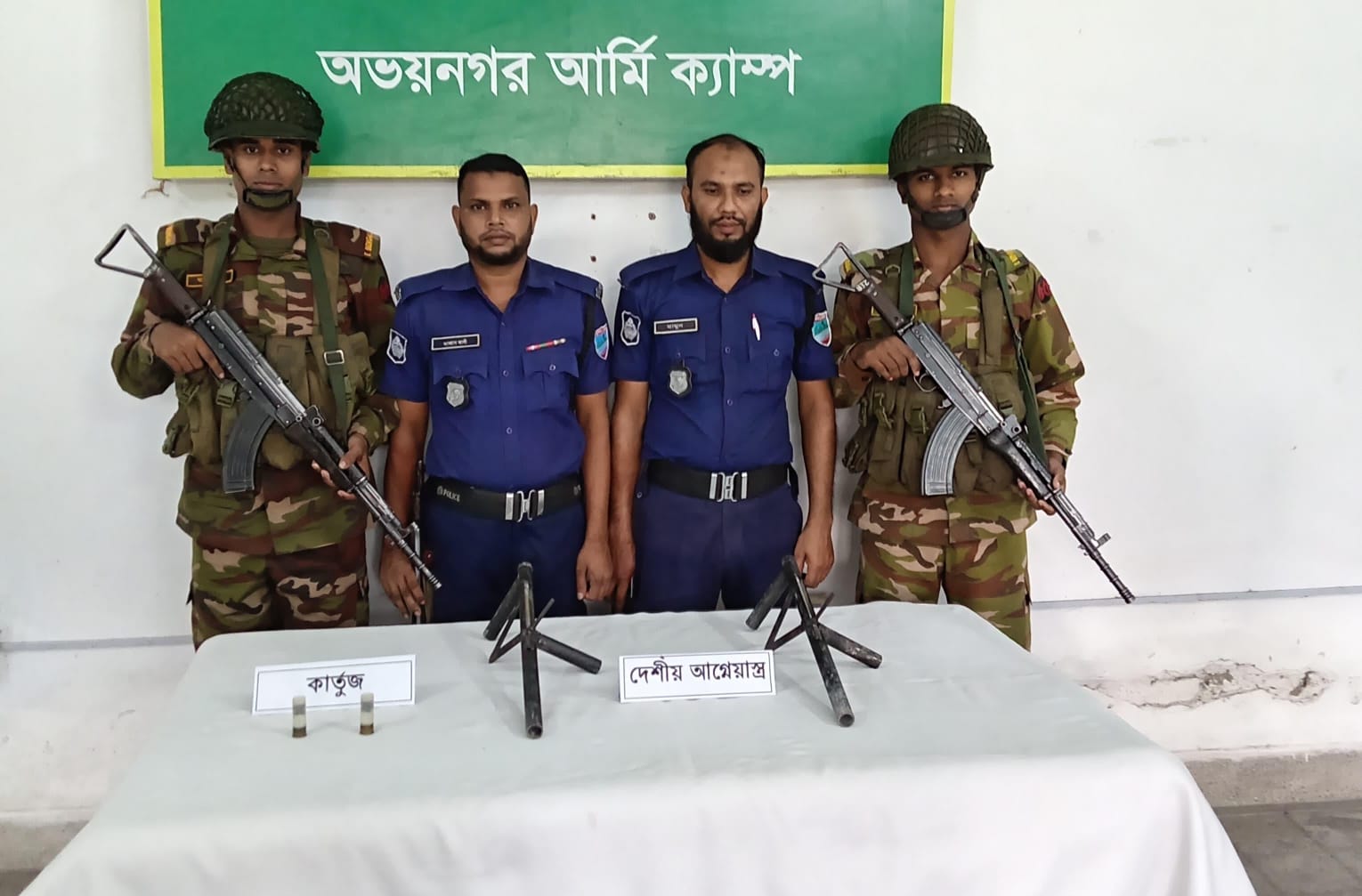 যশোরের অভয়নগর উপজেলায় যৌথ বাহিনীর বিশেষ অভিযানে উদ্ধার হয়েছে দুইটি দেশীয় আগ্নেয়াস্ত্র ও দুই রাউন্ড কার্তুজ। ভোররাতে প্রেমবাগ ইউনিয়নের মাগুরা গ্রামের শেখপাড়া এলাকায় এই অভিযান পরিচালনা করে সেনাবাহিনীসহ যৌথ বাহিনী। অভয়নগর আর্মি ক্যাম্প সূত্রে জানা যায়, রাত ২টা থেকে সকাল ৬টা ৩০ মিনিট পর্যন্ত ক্যাপ্টেন সানজিদ আহমেদ (২ ইবি)-এর নেতৃত্বে অভিযানে অংশ নেয় যৌথ বাহিনীর একটি টিম। গোপন সংবাদের ভিত্তিতে তারা আজহারুল নামের এক ব্যক্তির বাড়ির পাশের লাকড়ির ঘরে তল্লাশি চালিয়ে পাইপগান জাতীয় দুইটি দেশীয় অস্ত্র ও দুই রাউন্ড কার্তুজ উদ্ধার করে।