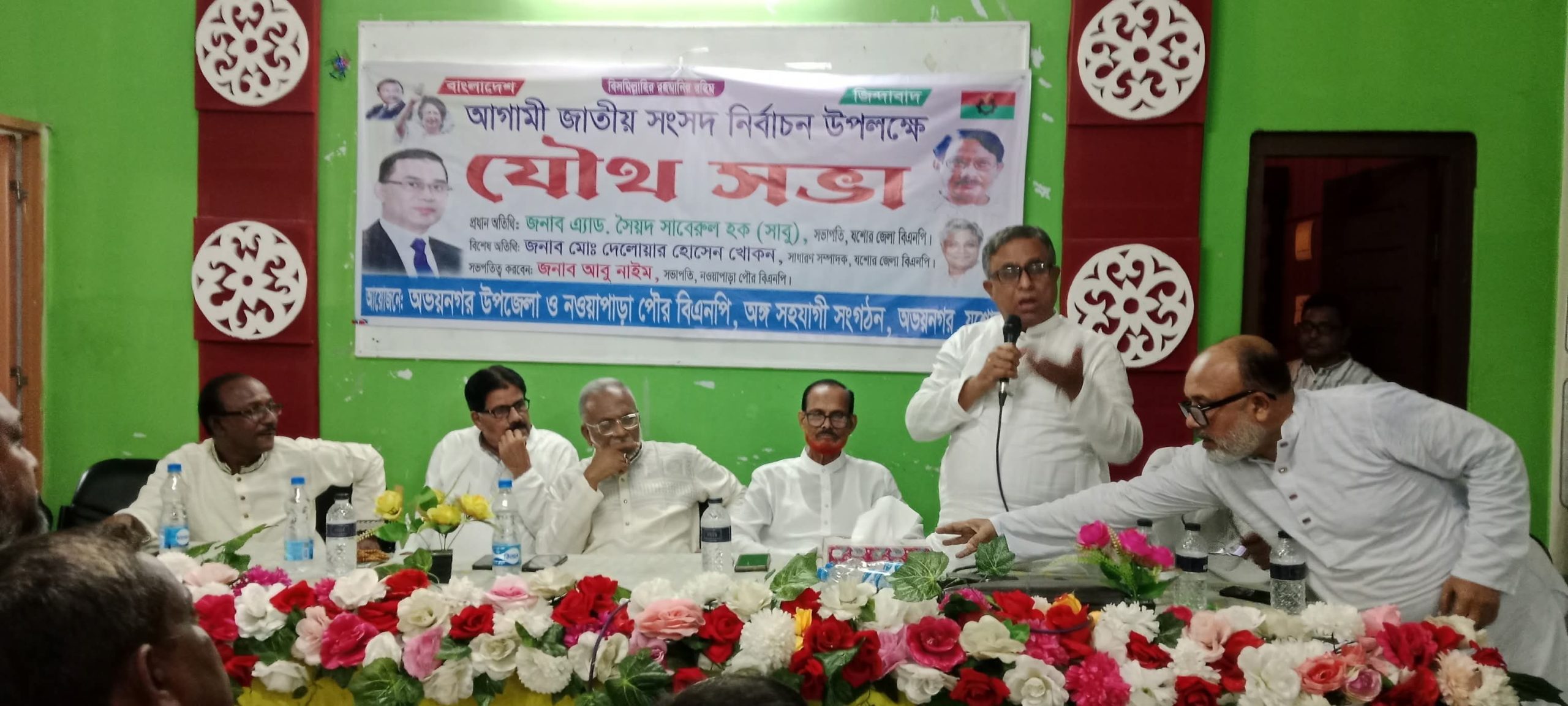 আগামী জাতীয় সংসদ নির্বাচন উপলক্ষে অভয়নগর উপজেলা ও নওয়াপাড়া পৌর বিএনপি ও সকল অংঙ্গ সংগঠনের যৌথসভা শুক্রবার বিকালে নওয়াপাড়া ইনিস্টিটিউট হলরুমে অনুষ্ঠিত হয়। উক্ত যৌথ সভায় সভাপত্ব করেন নওয়াপাড়া পৌর বিএনপির সভাপতি আবু নঈম মোড়ল, সভায় প্রধান অতিথি হিসেবে বক্তব্য রাখেন যশোর জেলা বিএনপির সভাপতি এ্যাডঃ সৈয়দ সাবেরুল হক সাবু, বিশেষ অথিতি হিসাবে বক্তব্য রাখেন যশোর জেলা বিএনপির সংগ্রামী সাধারণ সম্পাদক মোঃ দেলোয়ার হোসেন খোকন, বক্তব্য রাখেন বিএনপির জাতীয় নির্বাহী কমিটির সদস্য, কৃষক দল কেন্দ্রীয় কমিটির সিনিয়র যুগ্ম সাধারণ সম্পাদক ইঞ্জিনিয়ার টিএস আইয়ুব,জাতীয়তাবাদী শ্রমিক দল কেন্দ্রীয় কমিটির সিনিয়র সহ সভাপতি অভয়নগর থানা বিএনপির সভাপতি ফারাজী মতিয়ার রহমান,মহামান্য হাইকোর্টের সহকারী এ্যাটনিজেনারেল,