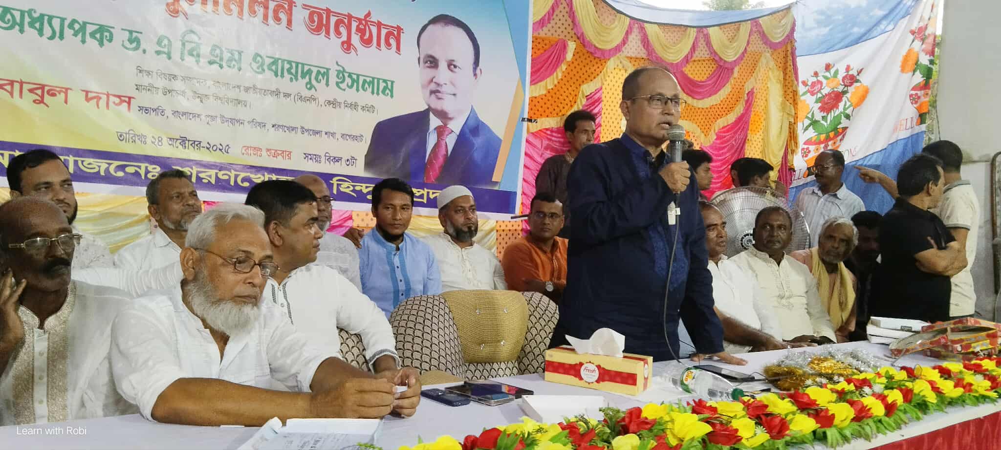 বাগেরহাটের শরনখোলায় জাতি ধর্ম নির্বিশেষে আমরা সবাই ভাই ভাই সংখ্যালঘু বলতে কোন কথা নাই এমন উক্তি প্রকাশ করে বাগেরহাটের শরণখোলায় সদ্য সমাপ্ত শারদীয় দুর্গা উৎসব উপলক্ষে শুভ বিজয়া পুনর্মিলনী অনুষ্ঠানে প্রধান অতিথি হিসেবে বাংলাদেশ জাতীয়তাবাদী দল বিএনপির কেন্দ্রীয় কমিটির শিক্ষা বিষয়ক সম্পাদক ও উন্মুক্ত বিশ্ববিদ্যালয়ের ভিসি অধ্যাপক ডক্টর এবিএম ওবায়দুল ইসলাম হিন্দু সম্প্রদায়ের অনুষ্ঠানে প্রধান অতিথি হিসেবে বক্তব্যে এমন মন্তব্য করেন। ২৪ অক্টোবর বিকেল সাড়ে চারটায় উপজেলার কেন্দ্রীয় মন্দির কমপ্লেক্স ভবন মিলনায়তনে হিন্দু সম্প্রদায়ের আয়োজনে বাংলাদেশ পূজা উদযাপন পরিষদের শরলখোলা শাখার সভাপতি শিক্ষক বাবুল দাসের সভাপতিত্বে ও শরণখোলা উপজেলা হিন্দু বৈদ্য ঐক্য পরিষদের সভাপতি আষীশ দাস ও সাধারণ সম্পাদক তাপস ভৌমিকের সঞ্চালনায় অনুষ্ঠিত সভায় আরো বক্তব্য রাখেন, শরণখোলা উপজেলা বিএনপির সাবেক সভাপতি ও সাবেক চেয়ারম্যান খান মতিয়ার উপজেলা বিএনপির সাধারণ সম্পাদক বেলাল হোসেন মিলন,শরণখোলা উপজেলা পূজা উদযাপন পরিষদের সাধারণ সম্পাদক গোপাল কর্মকার,, যুগ্ম সাধারণ সম্পাদক নির্মল কর্মকার, রাজাপুর সার্বজনীন গোবিন্দ মন্দির কমিটির সভাপতি স্মরণন সিকদার, হিন্দু ধর্মীয় নেতা লিটন মন্ডল, সমাজসেবক স্বপন কুমার কুন্ডু ও শিক্ষিকা রঞ্জিতা রানী।