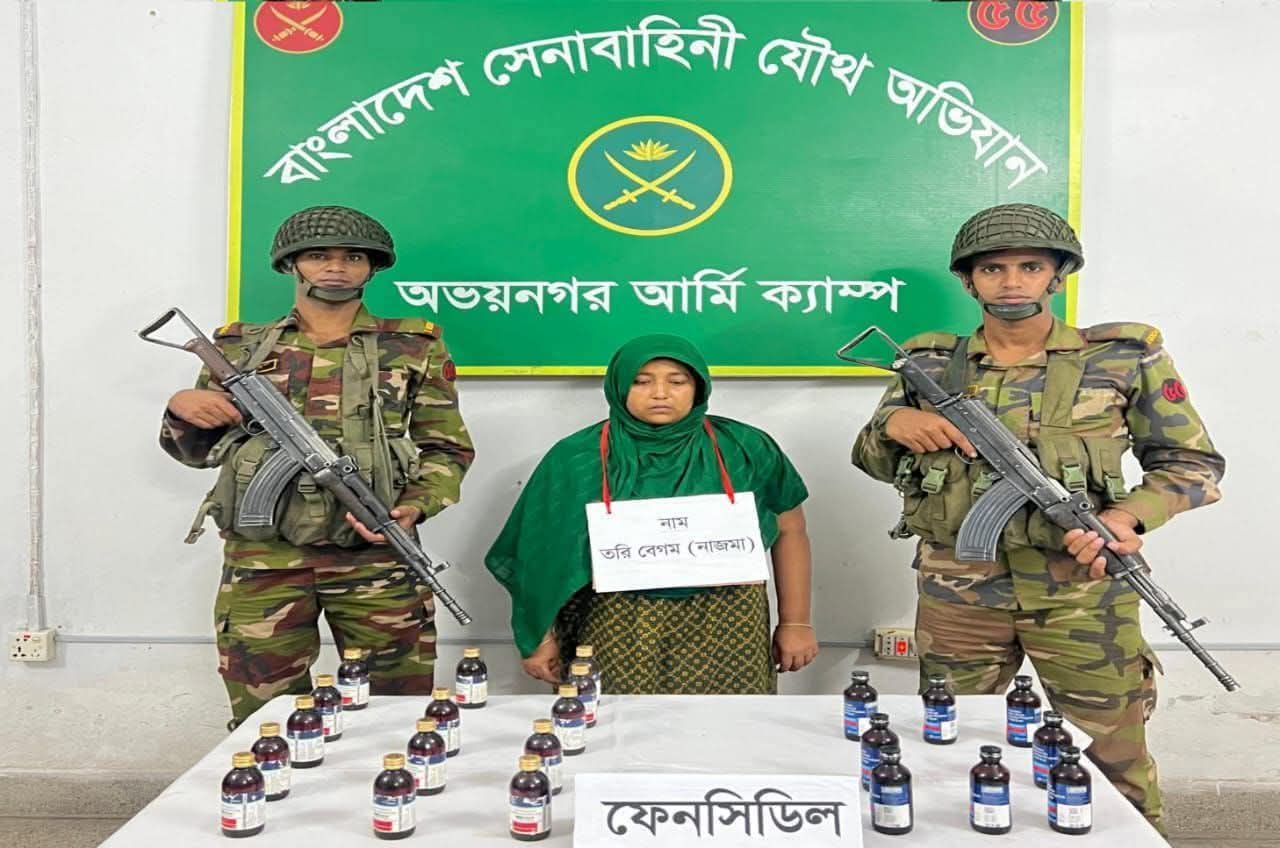যশোরের অভয়নগর উপজেলায় সেনা ও পুলিশ যৌথ অভিযান চালিয়ে ২২ বোতল ফেনসিডিলসহ তরি বেগম ওরফে নাজমা (৩৫) নামের এক নারী মাদক ব্যবসায়ীকে আটক করেছে। গতকাল (সোমবার) সন্ধ্যা আনুমানিক সাড়ে সাতটা থেকে রাত সাড়ে নয়টা পর্যন্ত অভিযান চালিয়ে উপজেলার বাঘুটিয়া ইউনিয়নের বিভাগদী গ্রাম থেকে তাকে আটক করা হয়। আটক নাজমা ওই এলাকার হাবিবুর শেখের স্ত্রী। পুলিশ ও স্থানীয় সুত্রে জানা যায়, নাজমা ওই এলাকার চিহ্নিত মাদক ব্যবসায়ী। দীর্ঘদিন সে এলাকায় মাদকদ্রব্য বিক্রি করে আসছিলেন। এ বিষয়ে অভয়নগর আর্মি ক্যাম্প (২ ইবি) কমান্ডার ওয়া: অফি: তাইজুল জানান, গোপন সংবাদের ভিত্তিতে মাদক ব্যবসায়ী নাজমাকে আটক করে তার বাসা তল্লাশি করে ২২ বোতল ফেনসিডিল উদ্ধার করে তাকে অভয়নগর থানা পুলিশের কাছে হস্তান্তর করা হয়েছে, পরবর্তী আইনি ব্যবস্থা প্রক্রিয়াধীন।