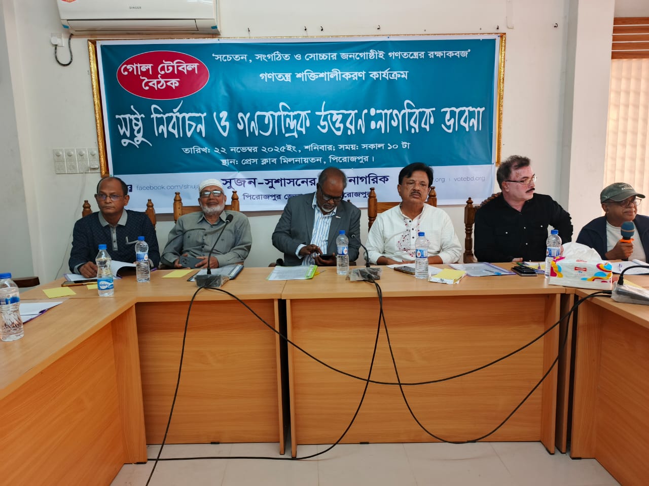 পিরোজপুরে সুজন–সুশাসনের জন্য নাগরিকের জেলা কমিটির উদ্যোগে রবিবার (২২ নভেম্বর) একটি গোলটেবিল বৈঠক অনুষ্ঠিত হয়েছে। অনুষ্ঠানটি জেলা সুজনের সভাপতি মুনিরুজ্জামান নাসিমের সভাপতিত্বে সম্পন্ন হয়। মূল আলোচক হিসেবে উপস্থিত ছিলেন সুজনের আঞ্চলিক সমন্বয়কারী মাসুদুর রহমান রঞ্জু। অনুষ্ঠানের সঞ্চালনা করেন জেলা সুজনের সাধারণ সম্পাদক অধ্যাপক শাহ আলম শেখ।
