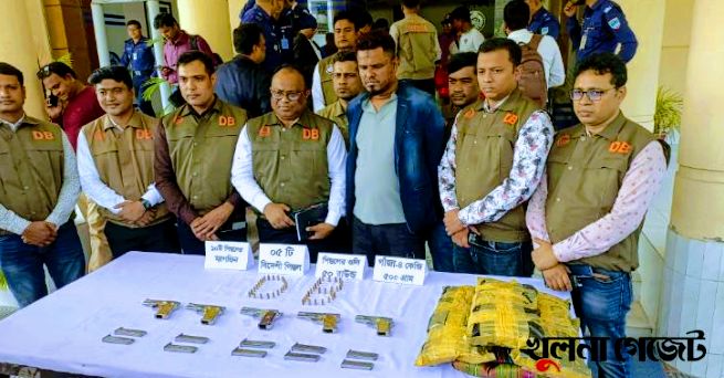 যশোরে জেলা গোয়েন্দা (ডিবি) পুলিশের বিশেষ অভিযানে ভারত থেকে আনা পাঁচটি বিদেশি পিস্তল, ১০টি ম্যাগাজিন, ৫০ রাউন্ড গুলি এবং সাড়ে ৪ কেজি গাঁজা উদ্ধার হয়েছে। এ ঘটনায় লিটন গাজী (৩৮) নামের এক যুবককে আটক করা হয়েছে। শনিবার (২৯ নভেম্বর) গভীর রাতে সদর উপজেলার নওয়াপাড়া ইউনিয়নের মধুগ্রামে এ অভিযান চালানো হয়।