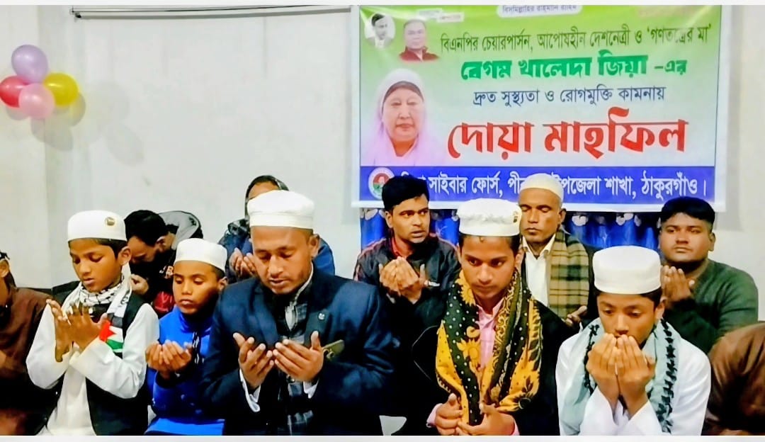চেয়ারপার্সন ও সাবেক প্রধানমন্ত্রী বেগম খালেদা জিয়ার সুস্থতা কামনা জিয়া সাইবার ফোর্স পীর গঞ্জ উপজেলা শাখা উদ্যোগে দোয়া ও মিলাদ মাহফিল অনুষ্ঠিত হয়েছে।