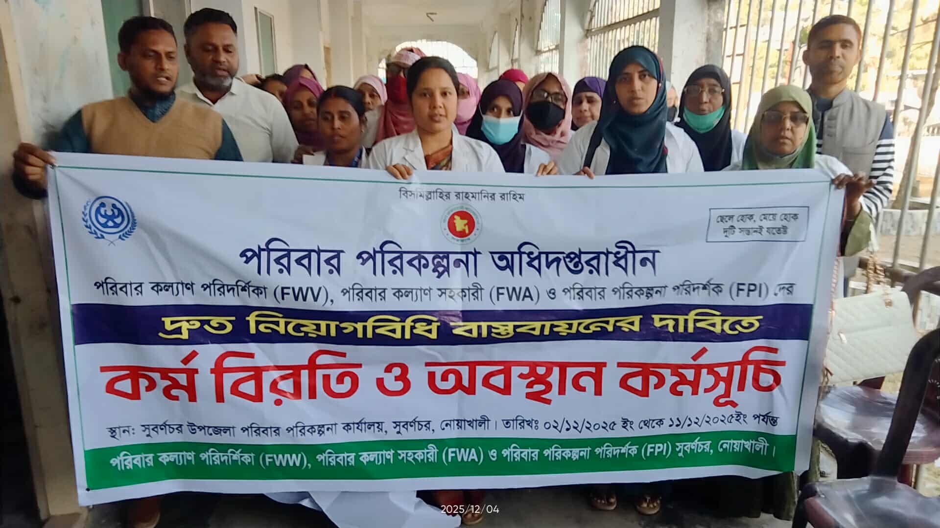 মঙ্গলবার সকাল সাড়ে ১০টার দিকে নিয়োগবিধি দ্রুত বাস্তবায়নের দাবিতে নোয়াখালী সুবর্ণচর উপজেলা পরিবার পরিকল্পনা কার্যালয়ের সামনে অবস্থান কর্মসূচিতে অংশ নেন পরিবারকল্যাণ পরিদর্শিকা, পরিবার পরিকল্পনা পরিদর্শক ও পরিবার কল্যাণ সহকারীরা।