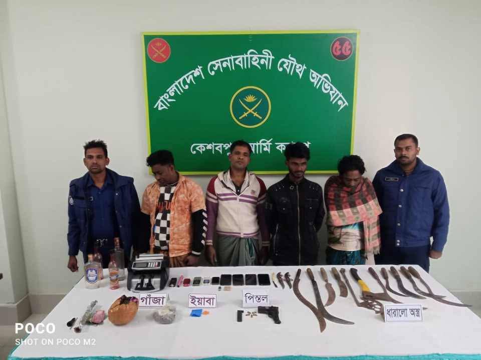 যশোরের কেশবপুর উপজেলায় যৌথ বাহিনীর পৃথক অভিযানে বিদেশি পিস্তল,গুলি,দেশিয় অস্ত্র, মাদক ও বিভিন্ন অপরাধে ব্যবহৃত সরঞ্জামসহ চারজনকে গ্রেফতার করা হয়েছে। শুক্রবার ভোররাতে উপজেলার আলতাপোল ও ভোগতি গ্রামে গোপন তথ্যের ভিত্তিতে এ অভিযান করা হয়। আটককৃতরা হলেন কেশবপুর উপজেলার ভোগতি গ্রামের আব্দুল আজিজের ছেলে আলমগীর (৪০), আব্দুল আজিজের ছেলে জাহাঙ্গীর হোসেন পলাশ (৩৭), মূল গ্রামের মফিজুর রহমানের ছেলে রাসেল(২২)ও আলতাপোল গ্রামের নজির বিশ্বাসের ছেলে উজ্জল (৩৮)। কেশবপুর থানা পুলিশ জানায়, ভোরে ভোগতি গ্রামের আলমগীর, জাহাঙ্গীর হোসেন পলাশ মূলগ্রামের রাসেল এবং আলতাপোল গ্রামের উজ্জল (৩৮)এর বাড়িতে তল্লাশি চালানো হয়। এসময় তাদের কাছ থেকে একটি মার্কিন তৈরি বিদেশি পিস্তল, ৫ রাউন্ড গুলি,একটি ম্যাগাজিন, দেশিয় দা, রামদা,খুর, চায়নিজ কুরাল, চাপাতিসহ ২০টির বেশি ধারালো অস্ত্র উদ্ধার করা হয়।