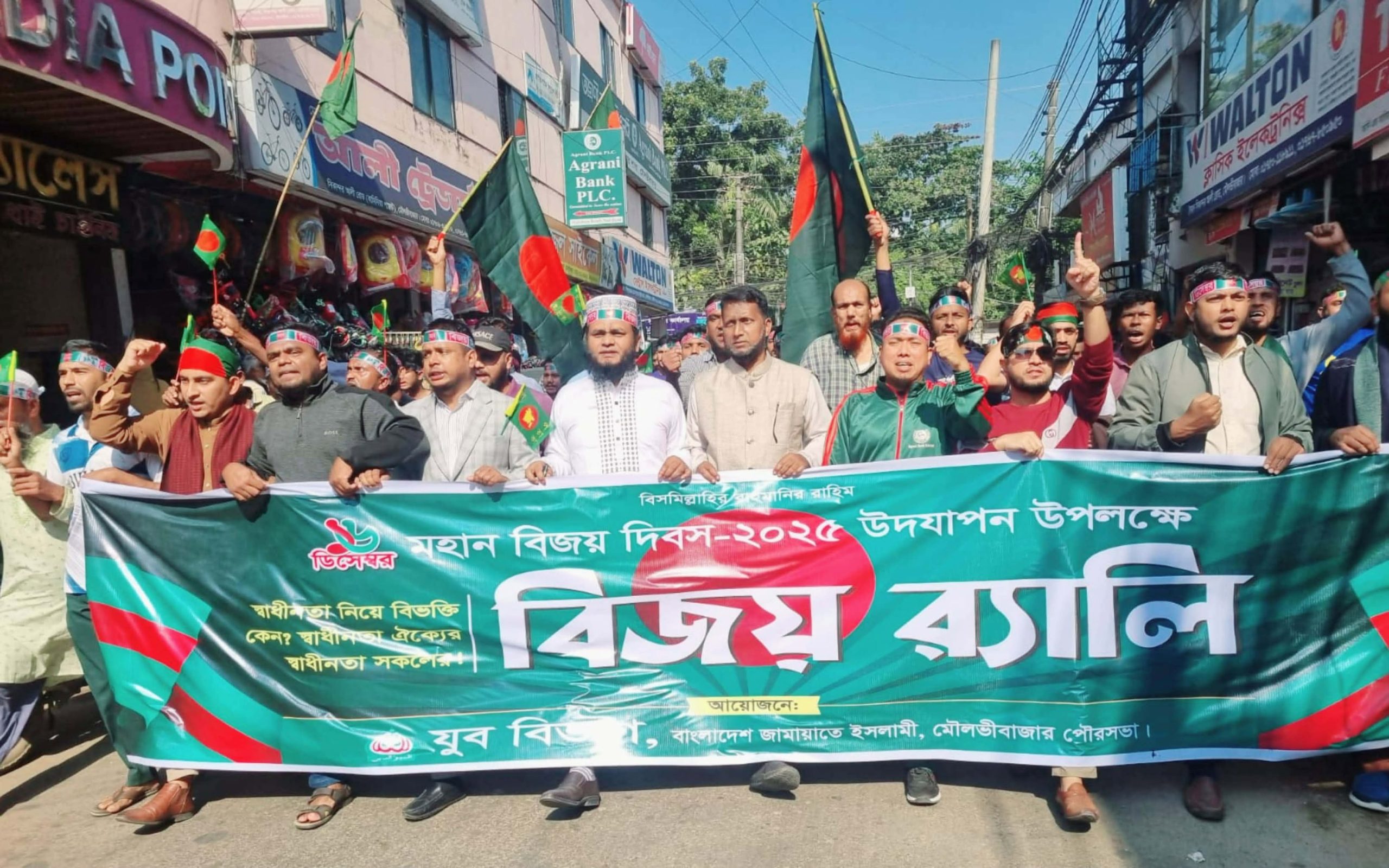 মহান বিজয় দিবস উপলক্ষে বাংলাদেশ জামায়াতে ইসলামী মৌলভীবাজার পৌর যুব বিভাগের উদ্যোগে এক বর্ণাঢ্য বিজয় র্যালি ও সমাবেশ অনুষ্ঠিত হয়েছে। মঙ্গলবার (১৬ ডিসেম্বর ২০২৬) সকাল ১১টায় পৌর যুব বিভাগের সভাপতি আবু নোমান মুয়িন-এর সভাপতিত্বে এবং সেক্রেটারি সাইফ উদ্দিন-এর সঞ্চালনায় র্যালিটি শুরু হয়। র্যালিটি মৌলভীবাজার শহরের বিভিন্ন গুরুত্বপূর্ণ সড়ক প্রদক্ষিণ করে জেলা জামায়াতে ইসলামীর কার্যালয়ের সামনে এসে শেষ হয়। র্যালি শেষে সেখানে এক সংক্ষিপ্ত সমাবেশ অনুষ্ঠিত হয়।