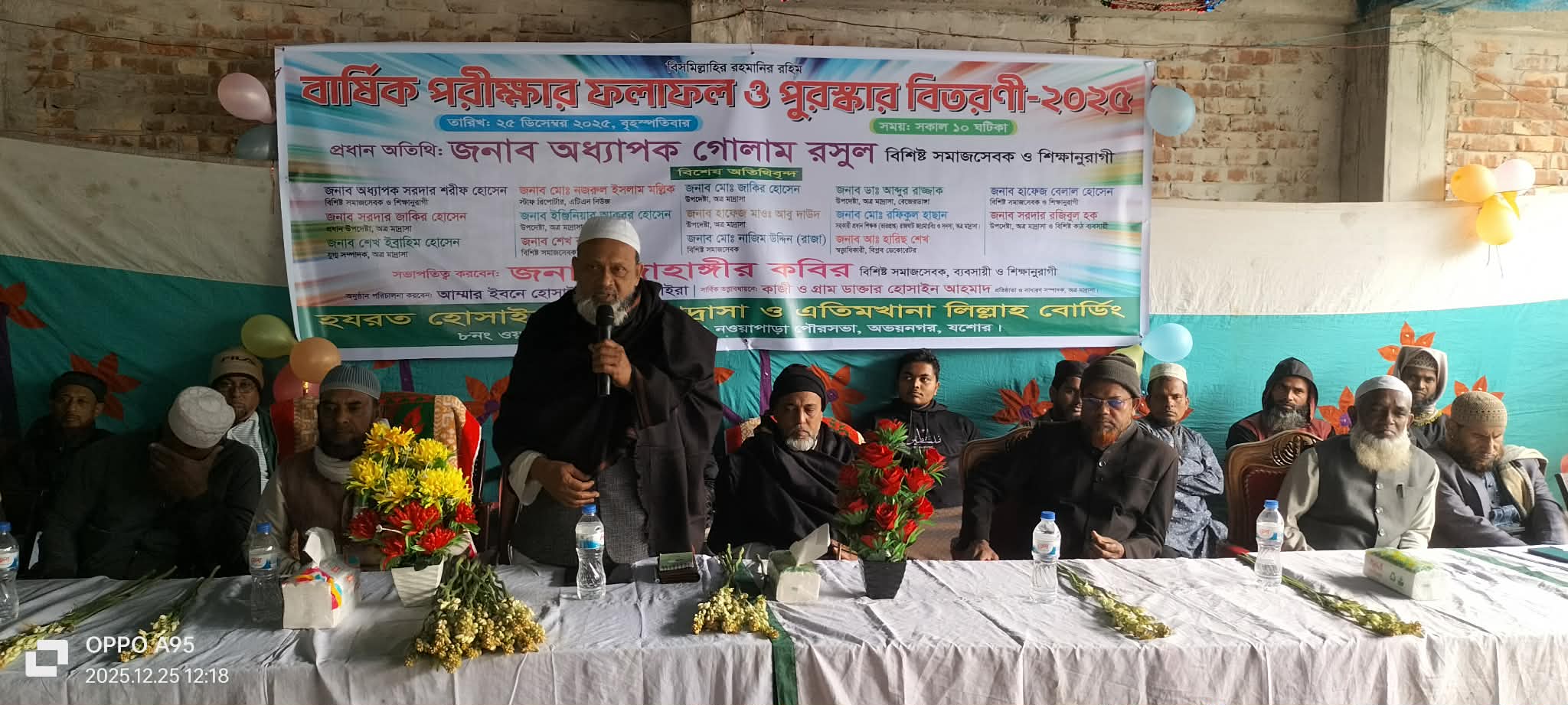 যশোরের অভয়নগরে হোসাইন (রা.) মাদ্রাসায় বর্ণাঢ্য আয়োজনের মধ্য দিয়ে বার্ষিক ফলাফল প্রকাশ ও পুরস্কার বিতরণী অনুষ্ঠান অনুষ্ঠিত হয়েছে। বৃহস্পতিবার সকালে প্রতিষ্ঠানের নতুন ভবনের নিচতলায় আয়োজিত অনুষ্ঠানে সভাপতিত্ব করেন বিশিষ্ট ব্যবসায়ী, সমাজসেবক ও শিক্ষানুরাগী জাহাঙ্গীর কবির। অনুষ্ঠানে প্রধান অতিথির বক্তব্য রাখেন বাংলাদেশ জামায়াতে ইসলামী যশোর জেলা আমির অধ্যাপক গোলাম রসুল। যৌথ সঞ্চালনা করেন আম্মার ইবনে হোসাইন ও বাংলা বিভাগের প্রধান শিক্ষক আব্দুর রহমান। বিশেষ অতিথি হিসেবে বক্তব্য রাখেন বাংলাদেশ জামায়াতে ইসলামী অভয়নগর থানা শাখার আমির সরদার শরীফ হোসেন, নওয়াপাড়া পৌর শাখার আমির মাওলানা আলতাফ হোসেন। এছাড়া শুভেচ্ছা বক্তব্য দেন উপজেলা পরিষদ জামে মসজিদের খতিব মাওলানা আবু দাউদ, প্রতিষ্ঠানটির উপদেষ্টা অধ্যাপক ডা. আব্দুর রাজ্জাক মোড়ল, উপজেলা জামায়াতের সহসম্পাদক গোলাম মোস্তফা, ফুলতলা ইউনিয়ন জামায়াতের আমির মো. মফিজুল ইসলাম, ইসলামী ছাত্রশিবির যশোর জেলার সভাপতি এস এম আশিকুজ্জামান, সাংবাদিক সুমন হোসেন ও সাংবাদিক কামাল হোসেনসহ আরও অনেকে।