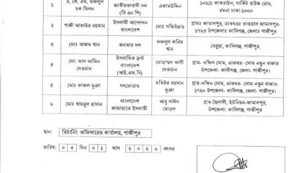 মোঃ মুক্তাদির হোসেন,স্টাফ রিপোর্টার আসন্ন ত্রয়োদশ জাতীয় সংসদ নির্বাচনকে সামনে রেখে ১৯৮, গাজীপুর-৫ (কালীগঞ্জ-পূবাইল-বাড়িয়া) সংসদীয় আসনে ৮ জন প্রার্থীর দাখিল করা মনোনয়নপত্র যাচাই-বাছাই শেষে ৬ জন প্রার্থীর মনোনয়নপত্র বৈধ ঘোষণা ...বিস্তারিত পড়ুন