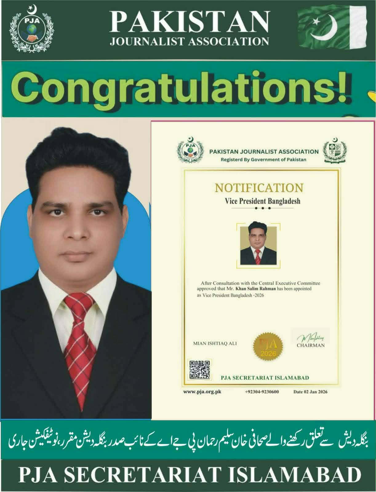 বিশ্বের বিভিন্ন দেশের পেশাদার সাংবাদিকদের সমন্বয়ে গঠিত আন্তর্জাতিক সংগঠন Pakistan Journalist Association (PJA)–এর কেন্দ্রীয় কমিটির সদস্য এবং বাংলাদেশ শাখার সহ-সভাপতি হিসেবে নির্বাচিত হয়েছেন Bangladesh Central Press Club (B.C.P.C)–এর প্রতিষ্ঠাতা সভাপতি ও জাতীয় দৈনিক মাতৃজগত পত্রিকার সম্পাদক খান সেলিম রহমান।