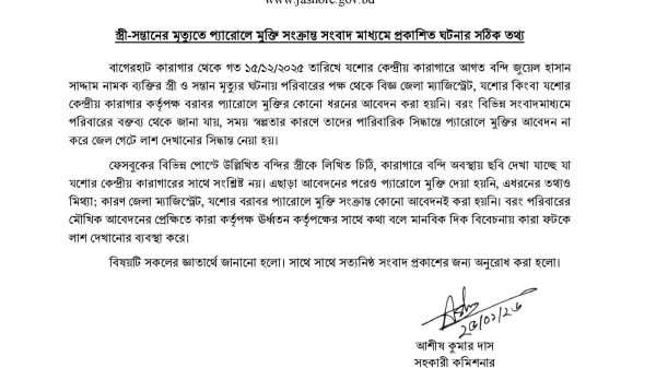 স্টাফ রিপোর্টার যশোর কেন্দ্রীয় কারাগারে আটক এক বন্দির স্ত্রী ও সন্তান মৃত্যুর ঘটনায় প্যারোলে মুক্তি দেওয়া হয়েছে, এমন খবর গণমাধ্যম ও সামাজিক যোগাযোগমাধ্যমে প্রচারিত হলেও তা সম্পূর্ণ অসত্য ও বিভ্রান্তিকর ...বিস্তারিত পড়ুন