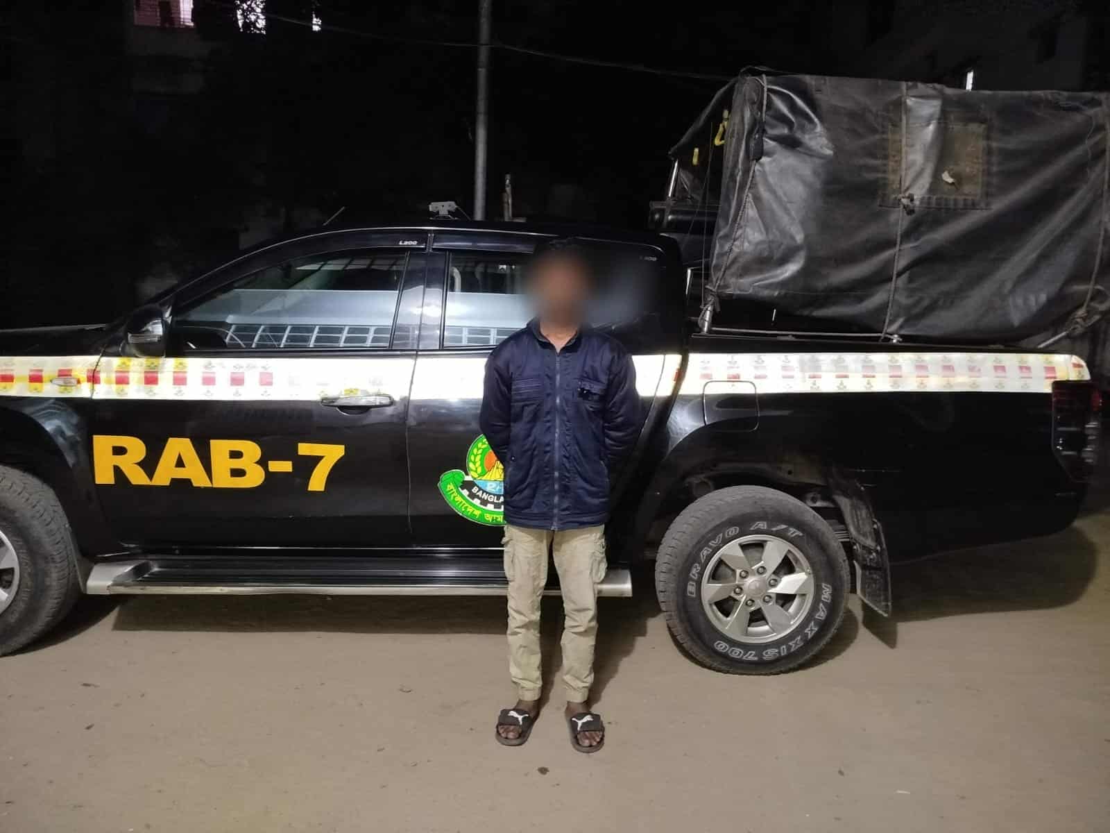 নোয়াখালী জেলার চাটখিল থানার একটি অপহরণ ও ধর্ষণ মামলার এজাহারনামীয় প্রধান আসামি মোঃ রাব্বি হোসেনকে গ্রেপ্তার করেছে র্যাব। র্যাব-৭, চট্টগ্রাম ও র্যাব-১১, নারায়ণগঞ্জের যৌথ অভিযানে তাকে গ্রেপ্তার করা হয়।র্যাব সূত্রে জানা যায়, ফেনী জেলার সদর থানার মামলা নম্বর-৫৩, তারিখ ২৭ জুলাই ২০২৫ ইং, ধারাঃ ৯(১)/৭/৩০, নারী ও শিশু নির্যাতন দমন আইন ২০০০ (সংশোধিত ২০০৩) এর এজাহারনামীয় প্রধান আসামি মোঃ রাব্বি হোসেন নোয়াখালী জেলার চাটখিল থানার একটি এলাকায় আত্মগোপনে রয়েছে—এমন গোপন সংবাদের ভিত্তিতে অভিযান পরিচালনা করা হয়।এরই ধারাবাহিকতায় গত ২৬ জানুয়ারি ২০২৬ ইং রাত আনুমানিক ৭টা ৫০ মিনিটে র্যাব-৭ ও র্যাব-১১ এর যৌথ আভিযানিক দল নোয়াখালী জেলার চাটখিল থানাধীন ৩নং পরকোট ইউনিয়নের ৫নং ওয়ার্ডের পূর্ব পরকোট এলাকায় অভিযান চালিয়ে তাকে গ্রেপ্তার করতে সক্ষম হয়।গ্রেপ্তারকৃত আসামি মোঃ রাব্বি হোসেন (১৯) লক্ষ্মীপুর জেলার রামগঞ্জ থানার আলীপুর গ্রামের বাসিন্দা। তার পিতার নাম জাফর আহম্মেদ।র্যাব জানায়, গ্রেপ্তারকৃত আসামির বিরুদ্ধে পরবর্তী আইনানুগ ব্যবস্থা গ্রহণের জন্য তাকে ফেনী সদর থানা পুলিশের কাছে হস্তান্তর করা হয়েছে।