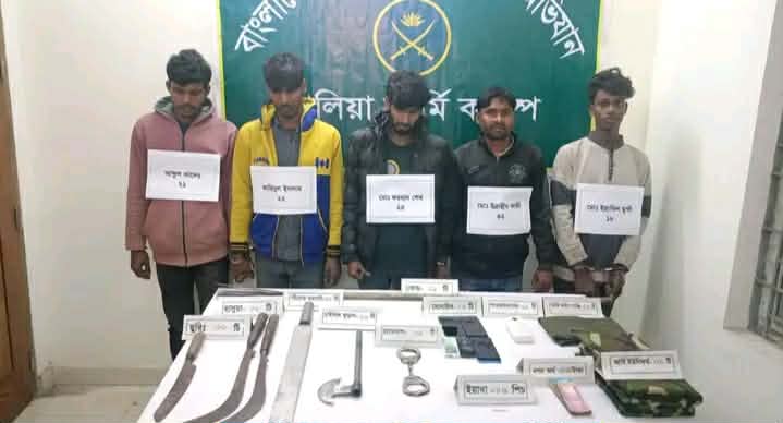 গ্রেপ্তার ব্যক্তিরা হলেন—দেবদুন গ্রামের মো. ইব্রাহিম কাজী (৩২), পিতা ইলিয়াস কাজী; ফরহাদ শেখ (২৫), পিতা শেখ সৈয়দ আলী; ইসরাফিল মুন্সি (১৬), পিতা ইব্রাহিম মুন্সি; জাহিদুল ইসলাম (২২), পিতা (মৃত) সারোয়ার এবং আব্দুল কাদের (২১), পিতা (মৃত) তাহাদ্দুদ। তাঁরা সবাই নড়াগাতি থানাধীন জয়ানগর ইউনিয়নের বাসিন্দা।