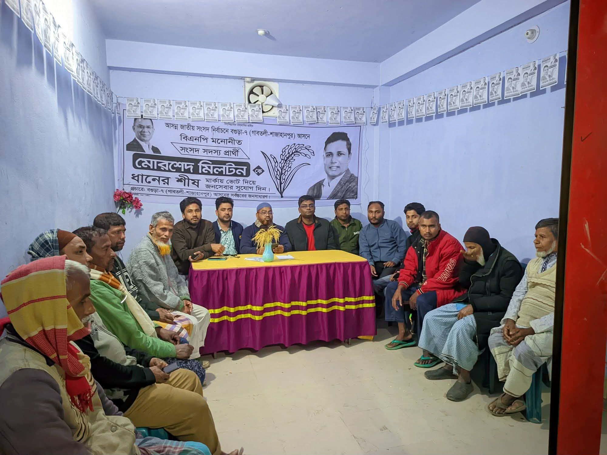 মিজানুর রহমান মিলন,শাজাহানপুর (বগুড়া) প্রতিনিধি ত্রয়োদশ জাতীয় সংসদ নির্বাচনে ৪২ বগুড়া-৭ ( শাজাহানপুর -গাবতলি) সংসদীয় আসনে বিএনপির মনোনীত প্রার্থী মোরশেদ মিল্টনের ধানের শীষ প্রতীকের নির্বাচনী প্রচারণা সুষ্ঠ ও সুশৃঙ্খল ভাবে বাস্তবায়নের লক্ষ্যে গত ৩০/০১/২০২৬ ইং,রোজ:-শুক্রবার ০৯ নং আমরুল ইউনিয়নের ১নং ভোট কেন্দ্রে ধানের শীষের নির্বাচনী পরিচালনা কমিটির আহবায়ক আমরুল ইউনিয়ন বিএনপির সাবেক সাধারণ সম্পাদক শাহাব উদ্দিন মিন্টুর সভাপতিত্বে এক আলোচনা সভা অনুষ্ঠিত হয়েছে । আলোচনা সভায় প্রধান অতিথি হিসাবে উপস্থিত ছিলেন শাজাহানপুর উপজেলা বিএনপির কোষাধ্যক্ষ ও আমরুল ইউনিয়ন বিএনপির আহবায়ক রফিকুল ইসলাম রফিক,এ সময় অন্যান্যদের মধ্যে উপজেলা বিএনপির দপ্তর সম্পাদক মাশফিকুর রহমান মামুন, ১নং ভোট কেন্দ্র পরিচালনা কমিটির প্রধান উপদেষ্টা মাহতাবউদ্দিন সন্টু,কেন্দ্র পরিচালনা কমিটির উপদেষ্টা মতিউর রহমান বাদশা,উপজেলা ছাত্রদলের সহ-সভাপতি ইমতিয়াজ পায়েল,প্রবীণ বিএনপি নেতা আতাহার আলী মোমদেল,আমিনুর রহমান, আলীমুদ্দিন মোল্লা,মমদেল মোল্লা,আমিনুর, ইউনিয়ন কৃষকদলনেতা আরজু,ওলামা দলের সদস্য সচিব নাফিস , স্বেচ্ছাসেবক দল নেতা রুম্মান,ছাত্রদল নেতা সোহেল,মিনহাজ,তানভীর, বাবু সহ আমরুল ইউনিয়নের বিভিন্ন পর্যায়ের নেতৃবৃন্দ উপস্থিত ছিলেন ।