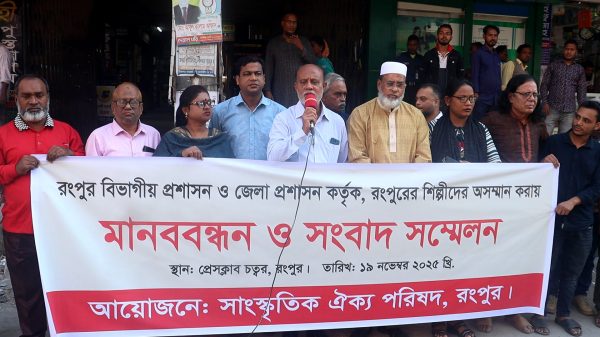 রিয়াজুল হক সাগর, রংপুর। রংপুর বিভাগীয় প্রশাসন ও জেলা প্রশাসনের হঠকারিতা ও রংপুরের শিল্পীদের অসন্মান করায় মানব্বন্ধন সমাবেশ অনুষ্ঠিত হয়েছে। বুধবার দুপুরে নগরীর প্রেসক্লাবের সামনে সাংস্কৃতিক পরিষদ রংপুরের আয়োজনে মানব্বন্ধনে
