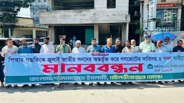 নিজস্ব প্রতিবেদক: মোঃ জালাল উদ্দিন। জুলাই জাতীয় সনদের ভিত্তিতে নির্বাচন ও পিপিআর পদ্ধতি অন্তর্ভুক্তসহ ৫ দফা দাবিতে মৌলভীবাজারে বিক্ষোভ মিছিল ও মানববন্ধন কর্মসূচি পালন করেছে বাংলাদেশ জামায়াতে ইসলামী এবং ইসলামী